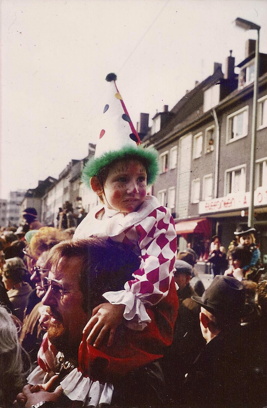 Und einmal, da hatte ich einen Großteil meiner Haare abschneiden lassen wollen, aber nicht beim Friseur, sondern meine Mutter sollte mir eine Glatze rasieren, denn es war abgemacht, dass ich Karneval als Clown gehen wollte, sollte, durfte. Aber als wir im Keller bei Roßkothen, dem Spielzeugladen in der Innenstadt, waren, da, wo es zu Karneval immer die Kostüme gab, gab es leider kein Augustkostüm mehr, vor allem nicht die aufsetzbaren Glatzen mit den gekräuselten roten Haaren an der Seite, denn die hatte ich haben wollen, der Rest des Kostüms war mir total egal gewesen. Und weil es die Haare nicht gab, wollte ich die Haare auf dem Kopf rasiert haben, denn rot waren sie ja sowieso, aber meine Mutter nähte mir ein Pierrotkostüm und schminkte mich und ich habe geheult und keinen Spaß gehabt an dem Karneval, obwohl mein Vater mich auf seinen Schultern getragen hat, aber gegenüber auf der anderen Seite des Zugs faxte mein bester Kindergartenfreund im Cowboykostüm mit Knarren herum, und das war natürlich viel, viel cooler als Pierrot.
